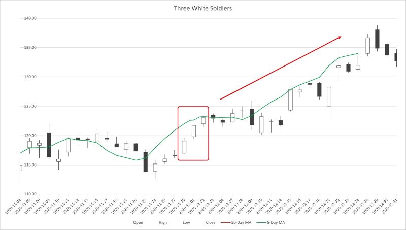 Three White Soldiers pattern is a bullish candlestick pattern that consists