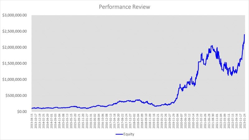 2013–08–08 to 2023–01–24, the backtesting Annual ROI of TSLA using the