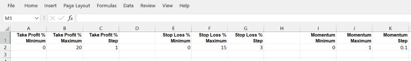 worksheet, set the scan ranges for Take Profit, Stop Loss, and Momentum,