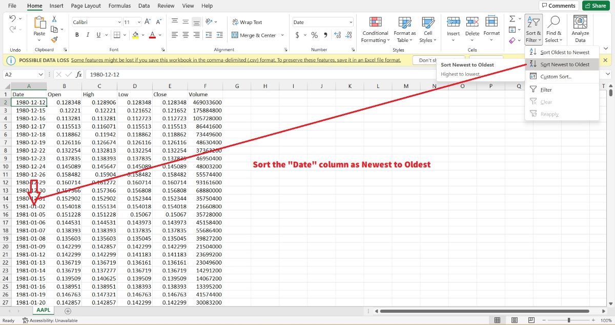 Click any cell in the “Date” Column. Sort the "Date" as Newest to