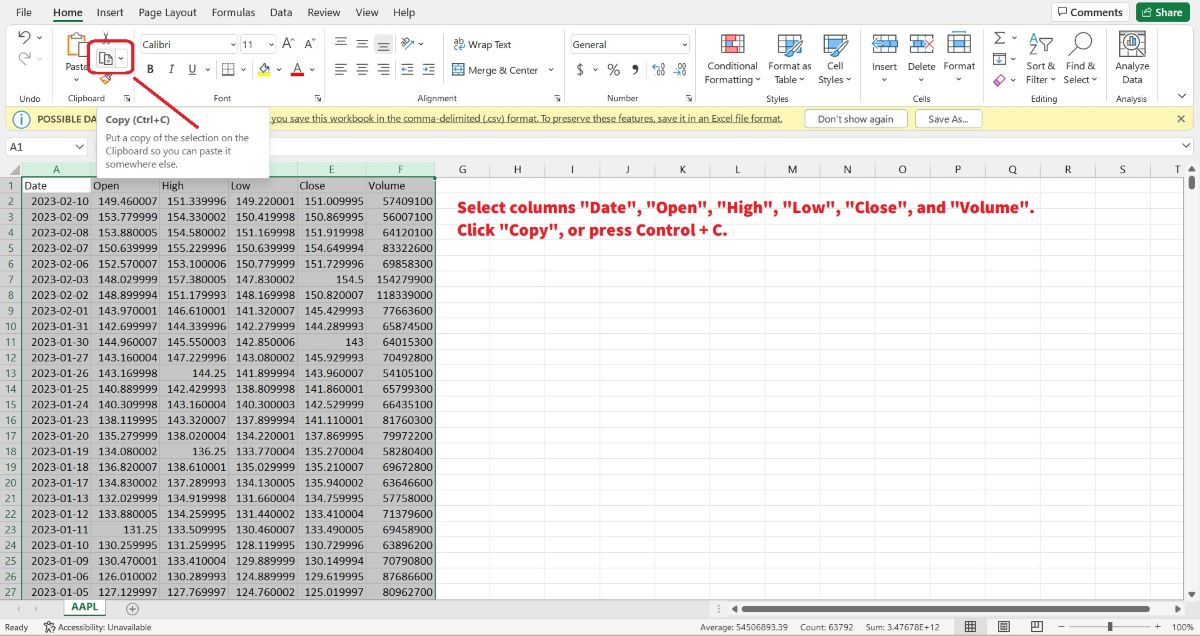 Select and Copy 6 columns including Date, Open, High, Low, Close and