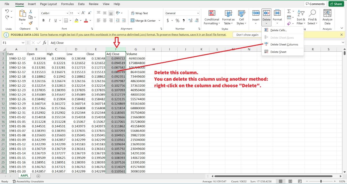 6 columns storing the Date, Open, High, Low, Close, and Volume historical